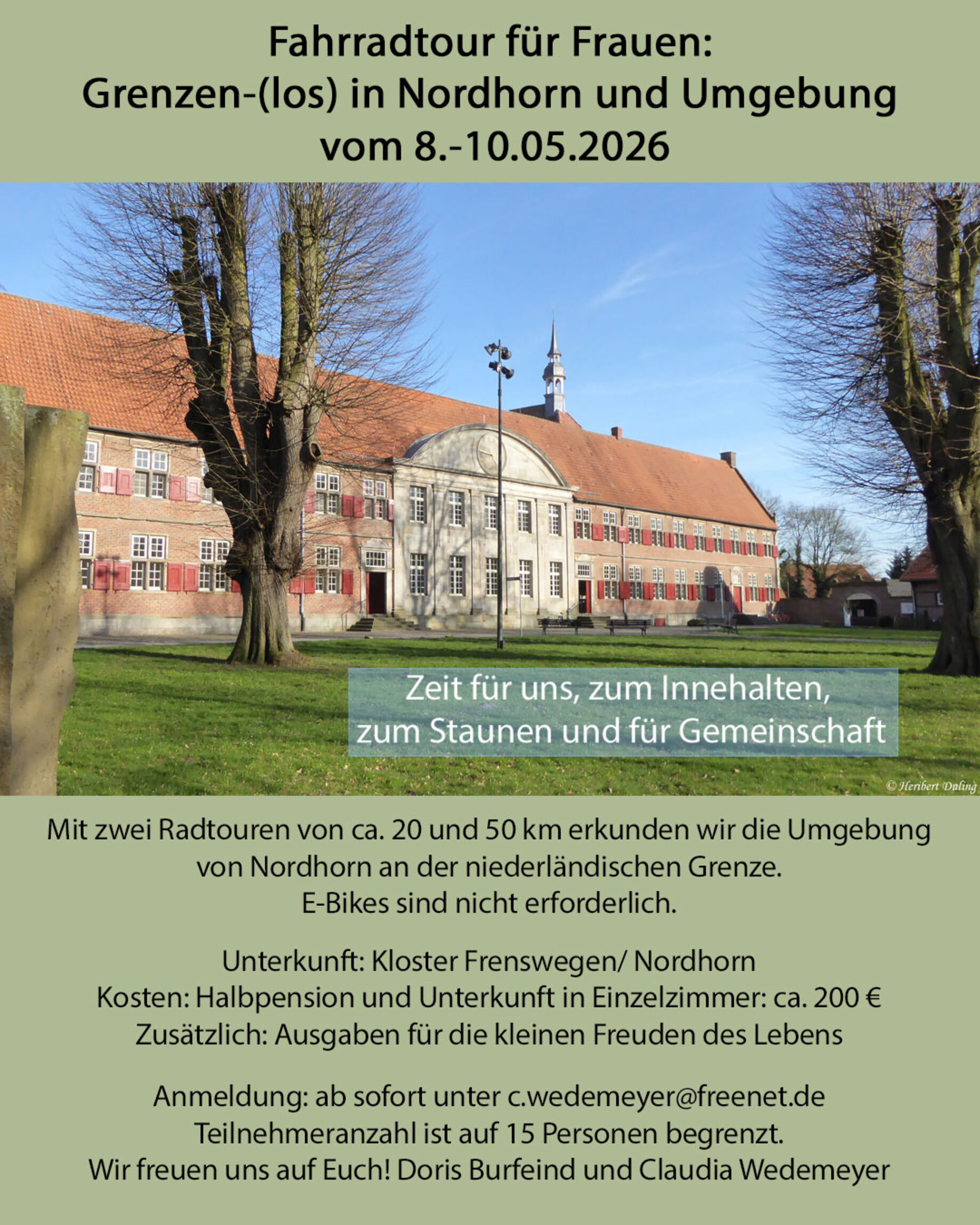 Wir laden ein zu einem Fahrradwochenende für Frauen mit Zeit für uns, zum Innehalten, zum Staunen und für Gemeinschaft. Von Freitag, den 8. Mai bis Sonntag, den 10. Mai 2026 wollen wir Nordhorn und die Umgebung an der niederländischen Grenze mit dem Fahrrad erkunden. Geplant sind zwei Radtouren von ca. 20 und 50 Kilometer. E-Bikes sind nicht erforderlich. Untergebracht sind wir im Kloster Frenswegen/ Nordhorn.
