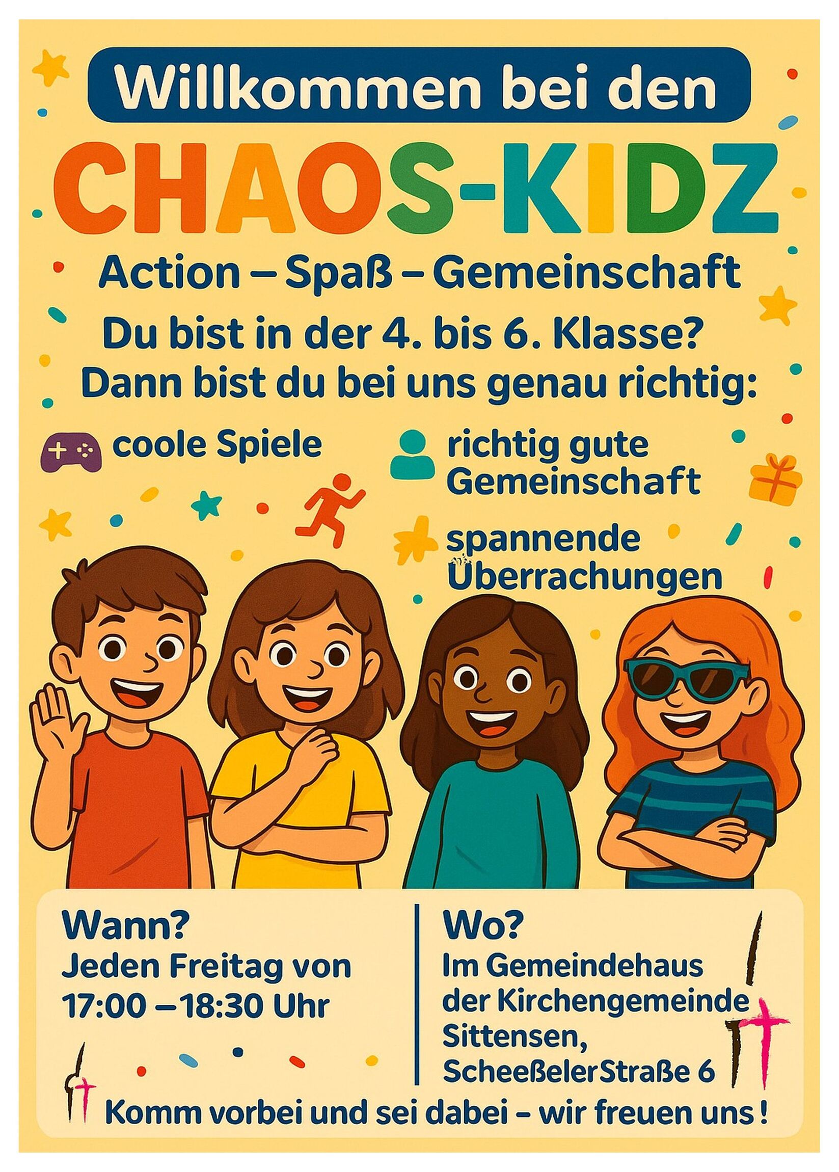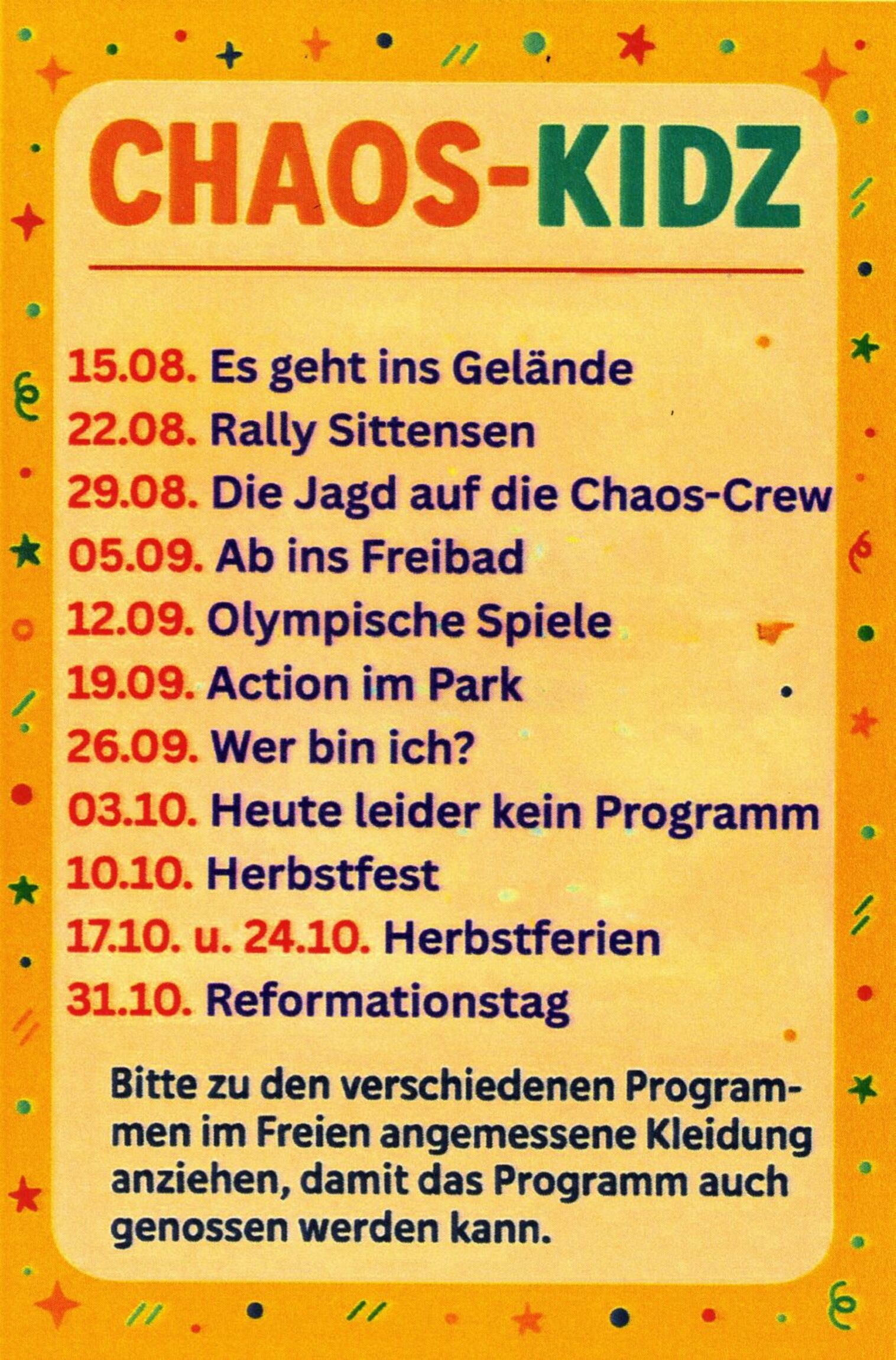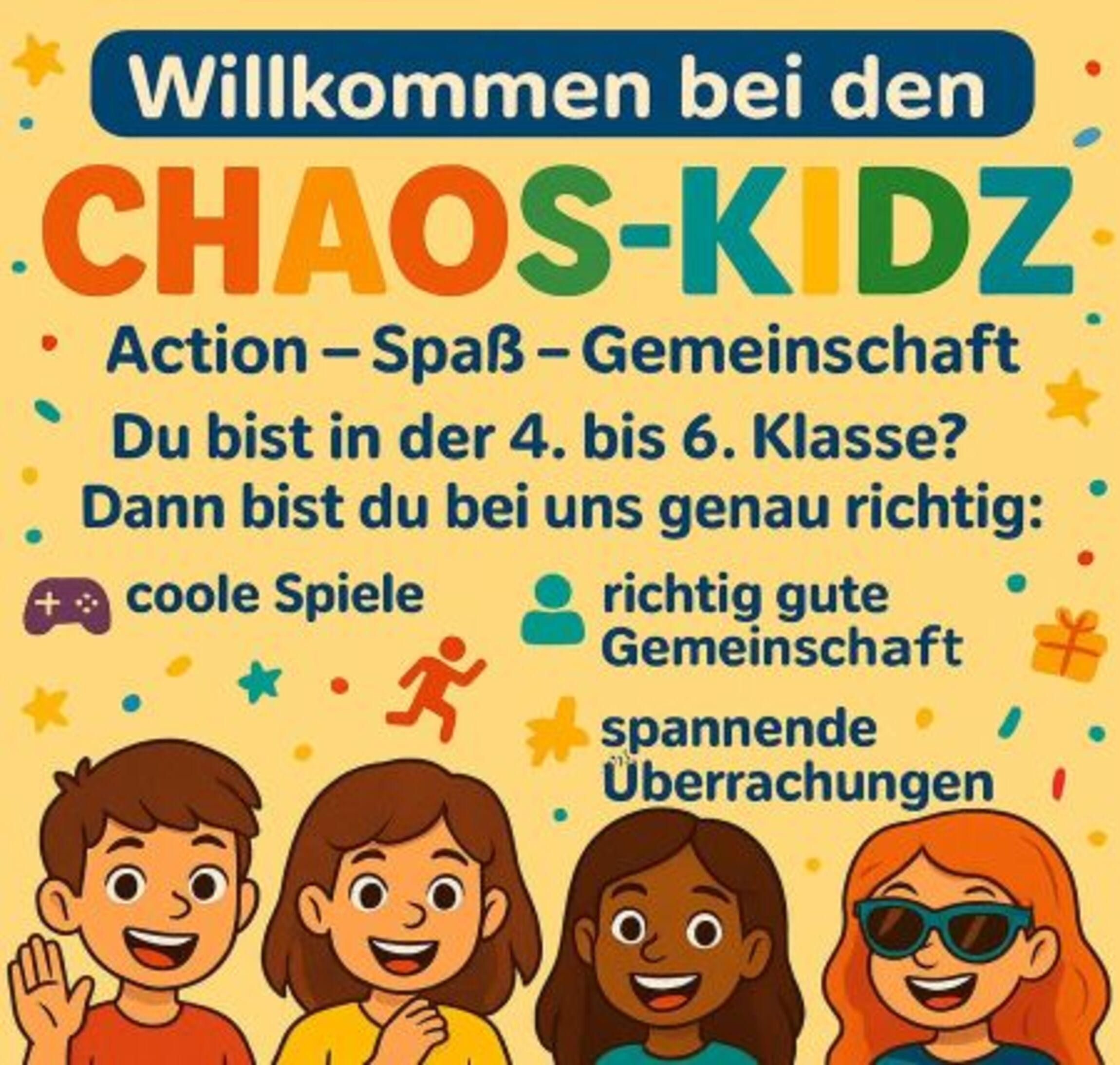 Wir haben ein neues Programm für Kinder gestartet: die „Chaos-Kidz“ ist ein Programm für Kinder der 4. – 6. Klassen. Wir wollen jeden Freitag von 17 – 18.30 Uhr mit den Kindern ein buntes und actiongeladenes Programm erleben, möglichst viel draußen unterwegs sein, spannende Geschichten hören und gute Gemeinschaft leben.